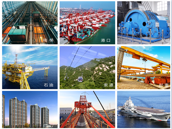 產(chǎn)品廣泛應(yīng)用于電梯、礦山、港口、石油、索道、電力、冶金、起重機(jī)械、船舶、工業(yè)、斜拉橋及軍事等領(lǐng)域。在國(guó)內(nèi)市場(chǎng)具有高份額的市場(chǎng)占有率,在國(guó)際市場(chǎng)遠(yuǎn)銷多個(gè)國(guó)家。